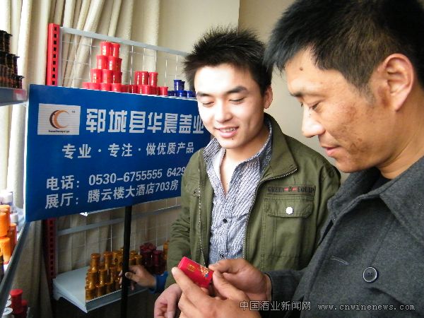 华晨盖业董事长曾凡想向《华夏酒报》记者介绍:“我们的目标是始终致力于用先进的设备、优质的原料、专业的技术,做高质量的产品,简单说就是专业、专注,做优质产品。”图为华晨盖业工作人员向客商介绍产品特点。