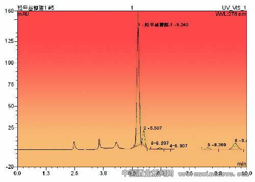称取试样4. 8g―5. 2g,置于125ml的心形瓶中,用约25ml蒸馏水稀释,然后加入30ml乙酸乙酯振荡5min,静置分层。将水层放入另一个心形瓶中,用30ml乙酸乙酯重复萃取两次,弃去水层,合并三次乙酸乙酯萃取液于另一心形瓶中,再加入10ml碳酸钠水溶液立即振荡,静置分层(此净化操作应在文章来源华夏酒报2min内完成)。再用20ml乙酸乙酯提取碳酸钠水层一次。弃去碳酸钠水层,合并乙酸乙酯提取液,并加入9滴冰醋酸,全部转移至旋转蒸发器内,于40℃―45℃下,蒸至剩余溶液约为1ml―2ml时,卸下心形瓶,在40℃下用氮气吹干,用1ml醋酸盐缓冲溶液溶解残留物,用带有0.45μm水系滤膜的针头式过滤器滤入样品瓶,作为试样溶液。如果试样溶液不能及时测试时,应先存放在冰箱中冷藏,但不得超过48小时。