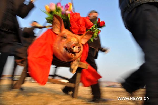 A live pig dressed up with red flowers is carried as a sacrifice in a ceremony of "Jihaijie" or "Sea Sacrifice Festival" in Tianheng Township, east China's Shandong Province, March 18, 2011. (Xinhua/Li Ziheng)