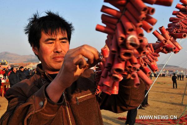 Fisherman Zhou Guofu hangs a string of firecrackers in a ceremony of "Jihaijie" or "Sea Sacrifice Festival" in Tianheng Township, east China's Shandong Province, March 18, 2011. (Xinhua/Li Ziheng)