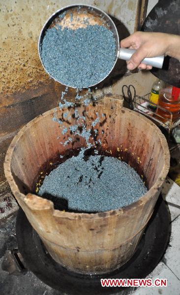 A retailer makes five-color glutinous rice in Nanning, capital of southwest China's Guangxi Zhuang Autonomous Region, March 27, 2011. (Xinhua/Lu Bo'an)