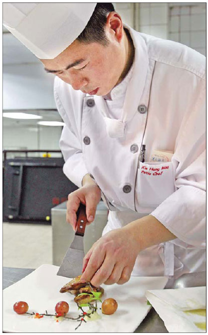 Chef Liu Zheng prepares pan-fried goose liver with grape salad, one of the star dishes at Metropark Lido Hotel Beijing. Photos by Zou Zhongpin / China Daily
