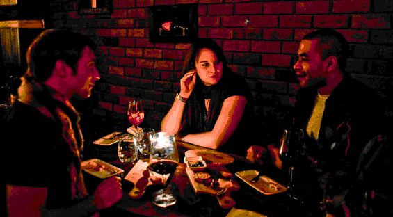 IN THE SEATS Britton Burdick, 23, who is “between jobs”; Fiona Thompson, 23, an actress; and Andre Locandro, 28, who works at a company that markets endografts, medical devices to treat abdominal aortic aneurysms. Mr. Burdick and Ms. Thompson are friends from college; Mr. Burdick and Mr. Locandro live in neighboring buildings near the wine bar and met at an event for members of Yelp, a Web site with users’ reviews of local businesses.