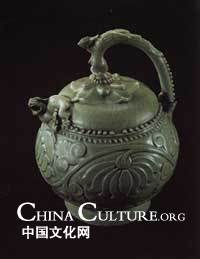 This can be seen in the Shaanxi Provincial Museum. The flagon was produced during the Northern Song Dynasty (960 - 1127). It has a round body and what appears to be the lid is like a persimmon pedicel. Its handle bears a phoenix that seems to be raising her head and about to take flight. The spout is carved into a female lion from whose mouth the wine pours. Under the lioness is her son, - the suckling little lion adds more interest to the body. The belly of the flagon is decorated with a peony flower pattern. On the underside of the flagon there is a hole like a plum blossom. It is here that the wine is poured into the vessel and the design is such that the liquid does not run out when it is returned to an upright position.