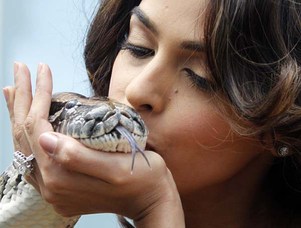 Bollywood actress Mallika Sherawat kisses a snake during a photocall on May 16, 2010. (Xinhua File Photo/Reuters Photo)