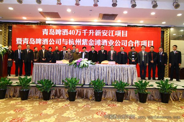 3月26日上午,青岛啤酒40万千升新安江项目暨青岛啤酒公司与杭州紫金滩酒业公司合作签约仪式在杭州隆重举行,杭州市委常委、副市长沈坚,浙江省啤酒工业协会会长付森林,建德市委书记陈春雷,建德市委副书记、市长董悦,青岛啤酒公司党委书记、副董事长王帆,青岛啤酒公司副总裁黄克兴等出席了签约仪式。
