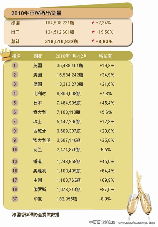 经历了连续两年的下滑,法国香槟酒的出口重新开始攀升,2010年增长19.5%,达到134,512,601瓶。中国更是第一次突破100万瓶,共计1,103,763瓶,涨幅为89.9%。