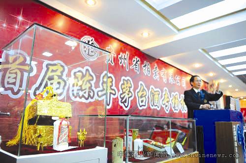 4月10日,由贵州省拍卖公司举办的“首届陈年茅台酒专场拍卖会”在贵阳开拍。102个标别的113瓶陈年茅台酒参加拍卖,总成交价值达1223.3万元。其中,一瓶被誉为“酒王”的“精装汉帝茅台酒”成交价高达890万元,刷新了茅台酒拍卖成交价格的历史纪录。图为陈年茅台酒专场拍卖会现场。