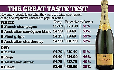 People struggled most when it came to differentiating between cheap and expensive claret. Despite being given either a £3.49 bottle or a £15.99 quality red, just 39 per cent chose the correct wine.