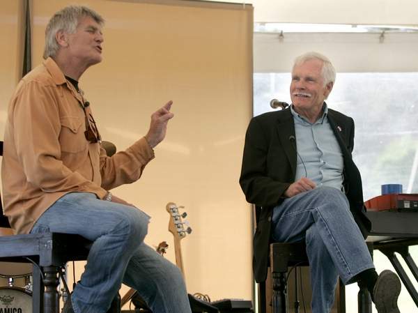 About 300 people listened to Turner discuss his hopes for the planet with National Geographic adventurer Boyd Matson at the benefit wine-tasting event.