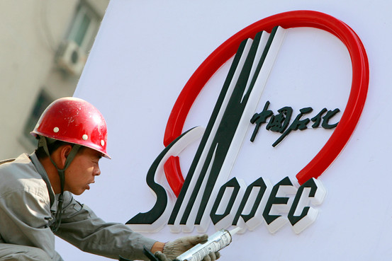A Chinese worker installs a Sinopec logo at a new station in Beijing. An anonymous posting of an invoice from a Guangdong branch of the company created a public-relations disaster for the oil-refining company.