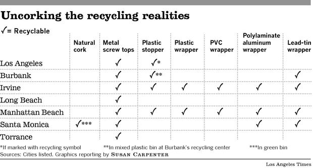 As for the stoppers, aluminum screw tops can be recycled. Plastic stoppers can be recycled as well, but only if they are marked with a chasing arrows symbol. Natural cork cannot go in the recycling bin, nor is it compostable in the green waste bin because it doesn’t break down fast enough in the city’s composters.