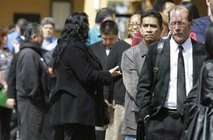 AP – FILE - In this March 22, 2011 file photo, job applicants wait in a long line at a job fair in San Jose, …