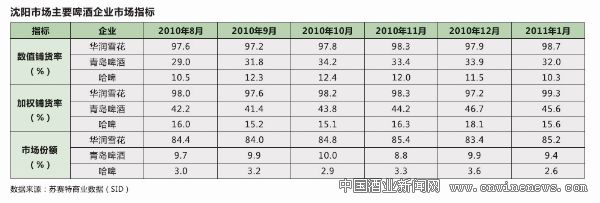 尽管哈尔滨啤酒背靠百威英博外资雄厚实力,但在沈阳市场依然未曾对雪花啤酒造成威胁,产能释放空间被挤压,导致年年亏损,另外一个锦州工厂则挽回了一些颜面,据苏赛特商业数据(SID)最新数据显示,今年1月份锦州市场哈尔滨啤酒占有率达到54%,而雪花啤酒则为25%,具有压倒性优势。
