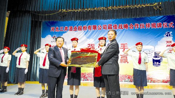 由于在过去8年的合作中建立了良好的默契,山东丽鹏股份有限公司与河北三井酒业股份有限公司决定建立一种更加紧密的合作关系。4月18日,山东丽鹏股份有限公司董事长孙世尧(左)与河北三井酒业股份有限公司董事长祁建发(右)共同揭开“最佳战略合作伙伴”的牌匾,由此拉开了双方强强联手、共创双赢的新局面。
