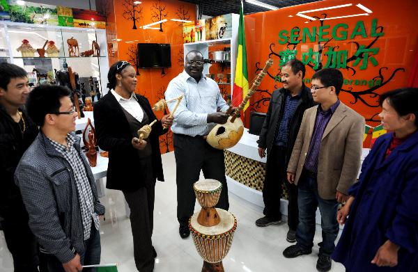 Senegalese traders play local musical instruments to attract consumers in the imported commodity hall of Yiwu International Trade City in Yiwu City, east China's Zhejiang Province, April 18, 2011. The newly-built market opened on Monday, selling more than 27,000 commodities from 55 countries and regions. (Xinhua/Zhang Jiancheng)