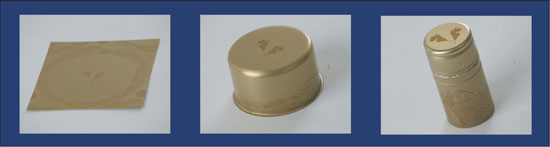 Distortion printing starts with a flat sheet of aluminum upon which the top and side printed images are applied. This technique utilizes high-quality computer assisted lithography. As the flat metal sheet is formed into the dimensions of the final cap, the desired side image is created. This single-step printing process allows for more flexibility in package design, saves considerable printing time and is generally more cost-effective than traditional methods.