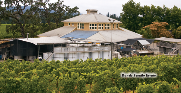 ●50 flat-plate solar thermal collectors on Kunde Family Estate south-facing roof send hot glycol to a 1,040-gallon water storage tank inside the winery, heating enough water to cut the winery annual bill for natural gas by half.