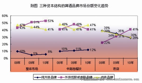 2009年以来,一些具有市场主导地位的雪花、青岛、燕京等品牌,为了减缓成本压力和满足利润需求,在一些具有绝对优势的区域市场开始尝试提价,取得了一定的效果。但是,在国家宏观经济政策和现有的啤酒市场竞争格局影响下,啤酒产品直接提价还不能完全实现,更多企业选择了产品结构升级的方式,加强了中高档啤酒销售比重或者不断推出新品和新包装提高均酒销售价格。产品升级的看点在各自品牌的强势区域,成熟市场是产品升级的基础。