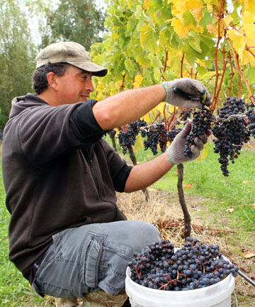 PICK OF THE BUNCH: Chris Wright handpicks merlot grapes at Golden Hills Estates vineyard.