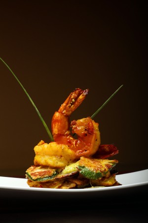 THE DISH: Garden Vegetable Napoleon with Jumbo Prawns and Red Curry Sauce