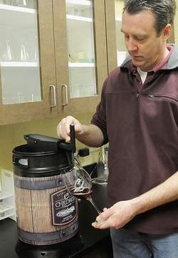 Childress Vineyards winemaker Mark Friszolowski demonstrates a pour from one of the self-contained wine kegs developed at the winery. The wine keg is portable for easy use by caterers or businesses that do not have space for taps. Buy photo