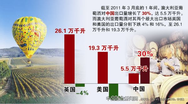 目前,中国已经成为澳大利亚葡萄酒增长最快的出口市场。荷兰合作银行(Rabobank)的数据显示,2010年,中国已经取代加拿大,成为澳大利亚第三大出口市场。澳大利亚政府下设的葡萄酒推广机构澳大利亚葡萄酒管理局(Wine Australia)的数据也表明,截至2011年3月底的1年间,澳大利亚文章来源华夏酒报葡萄酒对中国出口量增长了30%,达5.5万千升。而澳大利亚葡萄酒对其两个最大出口市场英国和美国的出口量分别下跌4%和16%,至26.1万千升和19.3万千升。
