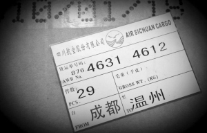 假酒的包装纸箱上都贴着一张成都至温州的货运单,经核实,这也是伪造的。