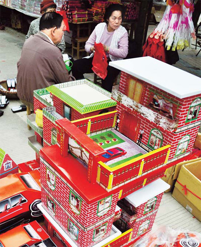 Paper-made offerings are displayed at a market in Nanning city, South China's Guangxi Zhuang autonomous region, on Tuesday. Lu Boan / for China Daily