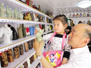 众多令人叫绝的藏品,不仅让袁爹爹成了社区的“名人”,经常有人慕名前来参观,而且在各种展览和比赛中也屡获大奖。在今年5月举办的盐城民间收藏博览会上,他的“珍稀薄瓷熊猫酒具”就被评为了金奖。
