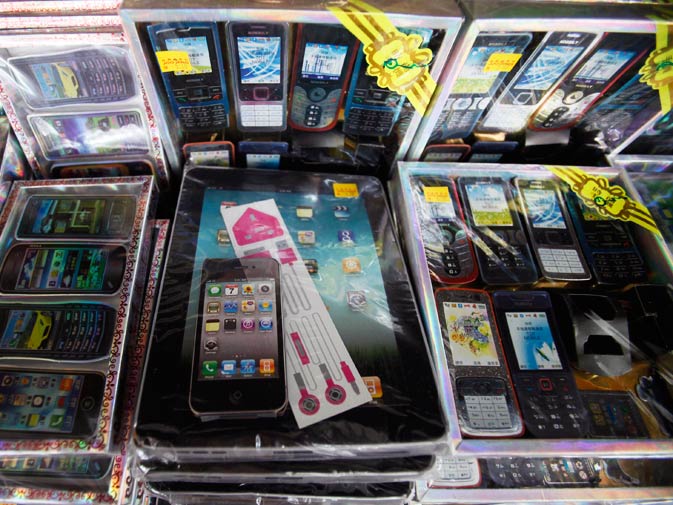 Paper replicas of first generation iPads and iPhones sit on a shelf among other electronic gadgets for sale for the Qingming festival at a prayer supplies shop in Malaysia. – Photo by Reuters