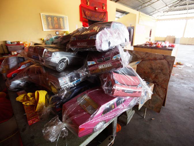 Paper replicas of cars are for sale at a temple in Malaysia. – Photo by Reuters