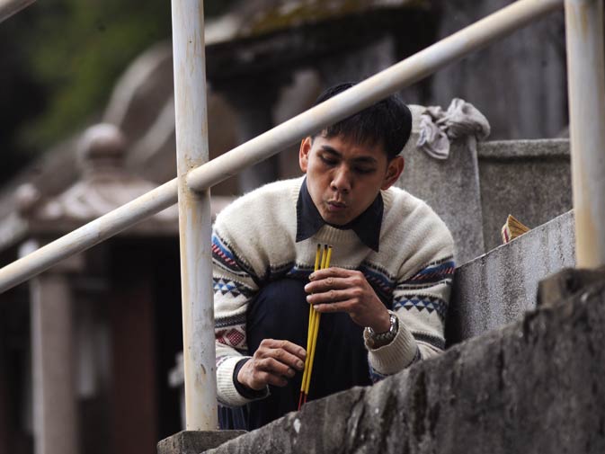 A man blows on incense sticks, used for offerings to the deceased, at a cemetery in Hong Kong. – Photo by AFP