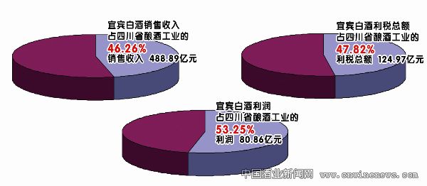 “十一五”期末,四川宜宾白酒生产企业发展到284家,其中规模以上企业达到28家,全市规模以上酒类企业完成酒类产量34.29万千升,销售收入达到488.89亿元,白酒规模以上企业利税总额实现124.97亿元文章来源华夏酒报,利润实现80.86亿元,分别比2007年增长138.35%、83.35%、124.77%和147.32%。宜宾白酒的销售收入、利税总额、利润分别占四川省酿酒工业的46.26%、47.82%和53.25%,比2007年实现了产量、销售收入、利税三个翻番。其中,宜宾白酒产值已达到四川省酿酒工业的50%、全国酿酒工业的20%。