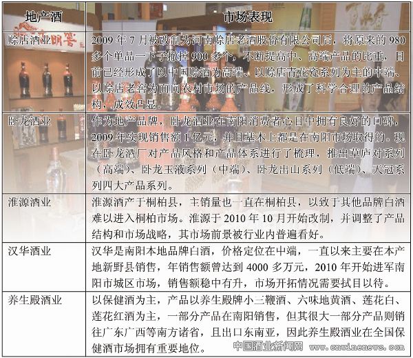 在南阳本地,有白酒生产许可证的企业22家,对市场具有影响力的是赊店、卧龙、淮源、汉华、养生殿这5家企业,南阳本地酒厂多是有数十年悠久历史的老厂,企业文化底蕴深厚,酒质、香型也符合本地消费者的口味,但由于本地市场对外地白酒不设防,外地品牌涌入太多,所以本地酒在本地的市场份额所占比例不到10%。