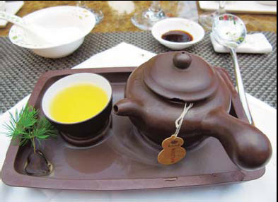 Tea is served in Zisha clay teapots and cups at Jue Pin Club.