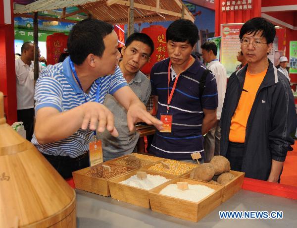 The agent of a local wine company introduces the local wine-making technology to investors during Wuyi International Investment Fair, held in Wuyi City, southeast China's Fujian Province, May 13, 2011. The 14th Wuyi International Investment Fair & Wuyishan International Tourism Festival kicked off Friday in Wuyi City. The fair has launched 60 key investment projects valued at 18.47 billion yuan (about 2.84 billion USD) and promoted the implementation of 171 projects for attracting investments. (Xinhua/Liu Yang)