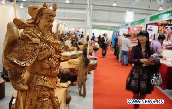 A visitor passes by a tree root carving during Wuyi International Investment Fair, held in Wuyi City, southeast China's Fujian Province, May 13, 2011. (Xinhua/Liu Yang)