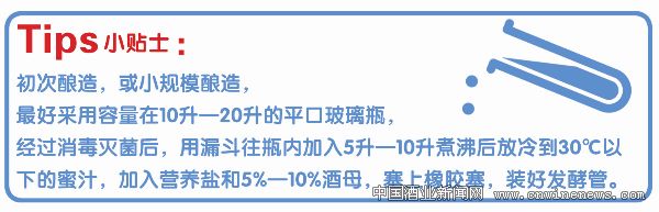 工业酿造在调配好的蜜汁中接种酒母以后,需要每天早晚两次测定和记录发酵醪的浓度和品温,以了解发酵的进程,发现问题及时调整。小规模酿造,注意观察二氧化碳气泡的发生量和控制室温即可。初次酿造,或小规模酿造,最好采用容量在10升—20升的平口玻璃瓶,经过消毒灭菌后,用漏斗往瓶内加入5升—10升煮沸后放冷到30℃以下的蜜汁,加入营养盐和5%—10%酒母,塞上橡胶塞,装好发酵管。发酵管球内倒上一点清水,起到过滤空气的作用,以后注意在发酵管球内保持一定的水量。较大量的酿造,可采用陶瓷大缸进行发酵,用75%酒精擦抹缸内壁进行消毒,倒入调配好的蜜汁,接种酒母,缸上盖一层纱布和一层塑料布。装入缸内蜜汁的数量约为大缸容量的70%—80%。