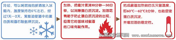 过滤,需要采用离心分离机、板式压滤机或微孔薄膜滤机等设备。冷却,可以将混浊的新酒放入冰箱内,温度保持在0℃左右,经过1天—2天,常能迫使酒中的蛋白质和酒石酸氢钾沉淀。加热,把蜜汁煮沸10分钟—30分钟,以消除蛋白质沉淀。加酒花有助于防止蛋白质沉淀的出现,但是它的苦味对蜜酒的口味有副作用;把成品酒加热到巴氏灭菌温度,即60℃—62℃3分钟,也能促使蛋白质沉淀,并增加酒的稳定性。然而,把散装酒直接加热是不可取的。在工业酒厂,是在密闭管道内使酒通过热交换器进行巴氏灭菌加热,或高温短时(98℃,几秒钟)加热的。小规模的,也可使酒通过浸在水浴锅内的蛇形管进行加热,这时必须保持酒液稳定的流速,以免加热过度。