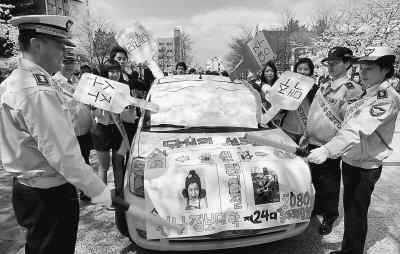 在韩国釜山,警察和学生在街头宣传酒后驾车的危险。人民图片
