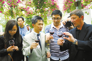 卡洛堡酒庄首席酿酒师杜戈特(右一)在介绍红酒文化