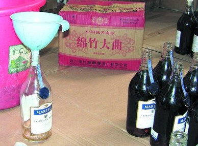 “犯罪嫌疑人勾兑假酒的速度非常快,方法也十分简单。”海口市公安局经侦支队三大队大队长赵江说,犯罪嫌疑人将原料酒倒入大桶内加入染色剂或调酒药品,调出与正品洋酒类似的颜色和味道。国内知名的白酒则多用以次充好的方式造假,用茅台王子酒调制茅台酒、用金六福酒调制五粮液,在灌入空酒瓶后贴上仿冒的防伪标识装箱,就堂而皇之地进入市场销售了。