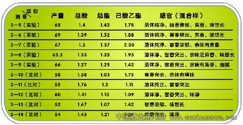 通过白曲、产酒酵母和中温曲的混合使用,不仅可使其淀粉得到最大限度的利用,而且酒体风格有了明显的改善。酒体的纯净度及回甜感增加,从实验结果表明,实验窖池比对比样每甑多出酒10kg—15kg左右。