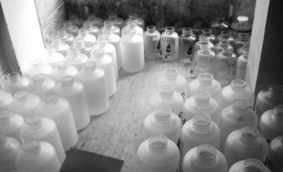 葫芦岛警方一举捣毁生产假酒的黑窝点,犯罪嫌疑人用自来水、酒精、添加剂勾兑成假酒。图为收缴的崔某生产的假酒以及酒瓶等。