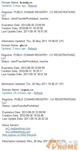 目前Brandy.co和Gin.co的whois信息最新变更时间为5月26日,Cognac.co为5月19日。三个域名均注册于2010年,目前持有人暂不清,注册地显示为PUBLIC DOMAIN REGISTRY .CO REGISTRATIONS, LLC,和Tequila.co及Vodka.co信息一致,买家为同一人的可能性极高。