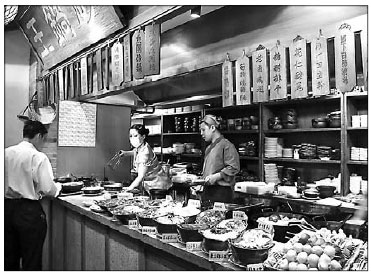 Guests can order food two ways at Nanjing Impressions - either from a menu or by browsing the counters where a variety of snacks are displayed underneath wooden plaques engraved with dish names. Ye Jun / China Daily