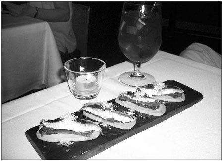 Shortbread with olive tapenade, piquillo red pepper, white anchovies and Manchego cheese at Uno Mas. Donna Mah / for China Daily