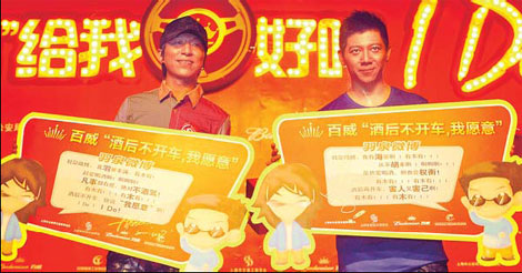 Chinese pop duo Yu Quan - Chen Yufan (left) and Hu Haiquan (right) - present awards to winners of "I Do", a campaign initiated by Belgium-based brewer AB InBev aimed at promoting designated driving and responsible drinking in China. Provided to China Daily