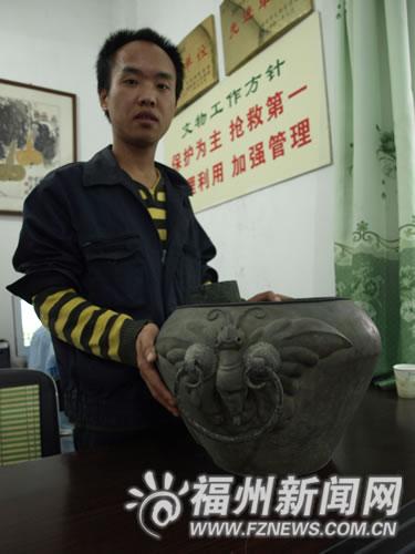这是什么玩意儿?闽侯县博物馆馆长曾江初步判断,这是清末民初的温酒器。“你看,这火筒是盛放木炭的,还有炭灰出口。这是用来加热的,缸内盛放美酒。”曾江说,两侧饰物可能是蝙蝠,寓意是有口福。